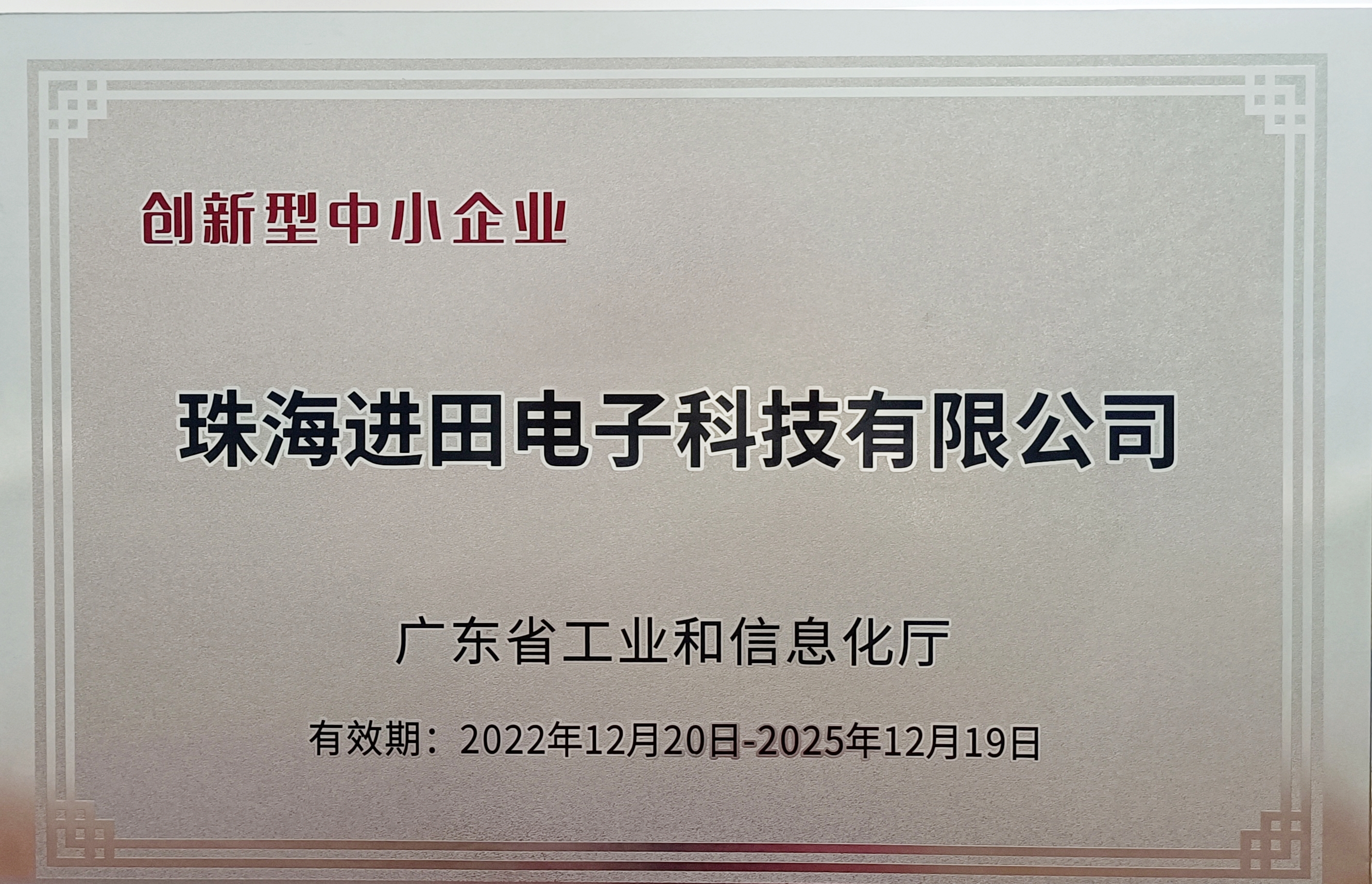 热烈祝贺珠海进田电子科技有限公司荣获创新型中小企业称号